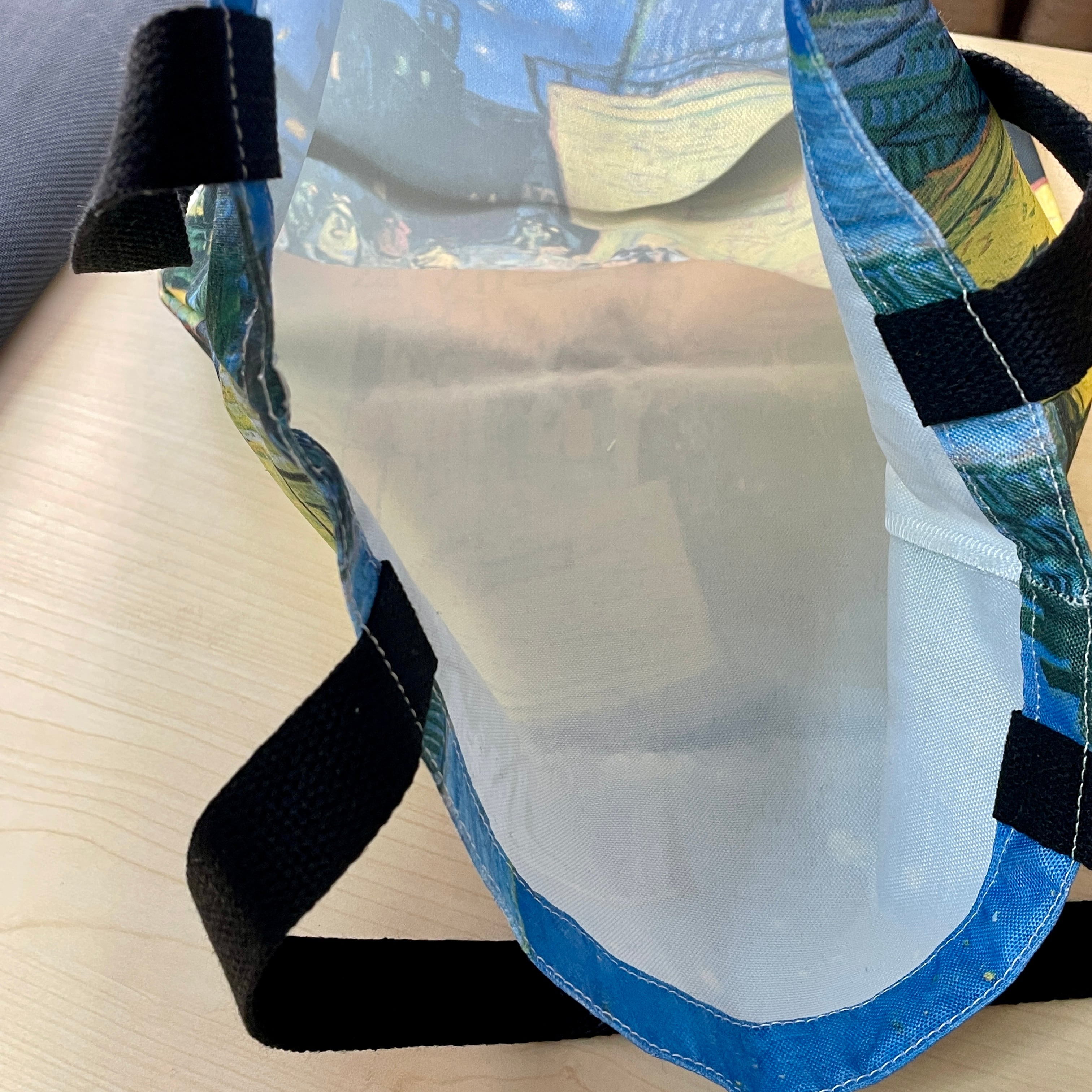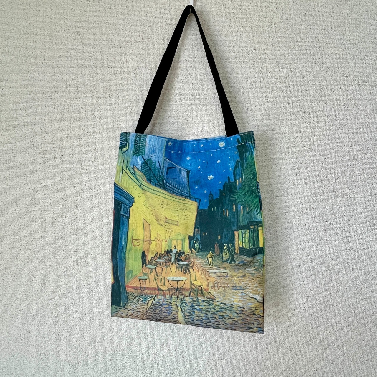 フィンセント・ファン・ゴッホの名画《夜のカフェテラス》を両面に鮮やかにプリントしたアートトートバッグです。深いブルーの夜空と、暖かなカフェの灯りが映える印象的なデザインで、日常使いはもちろん、アート好きへのギフトにもぴったり。