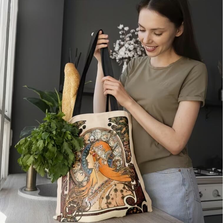 ミュシャの名画を両面に鮮やかにプリントしたアートトートバッグです。ミュシャならではの美しい女性像が映える印象的なデザインで、日常使いはもちろん、アート好きへのギフトにもぴったり。