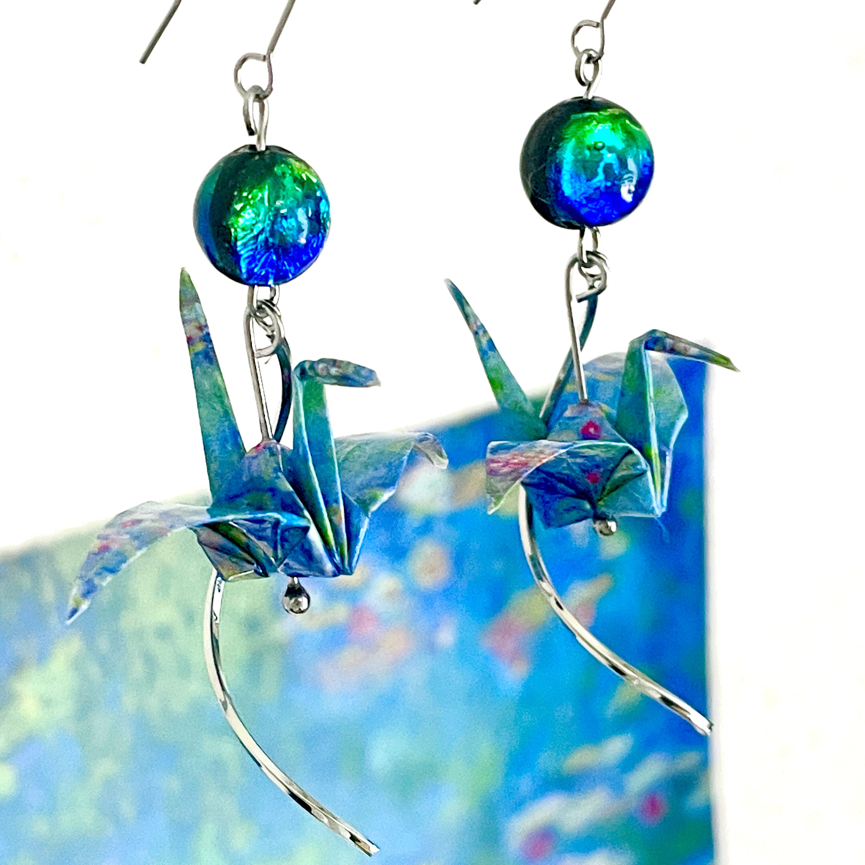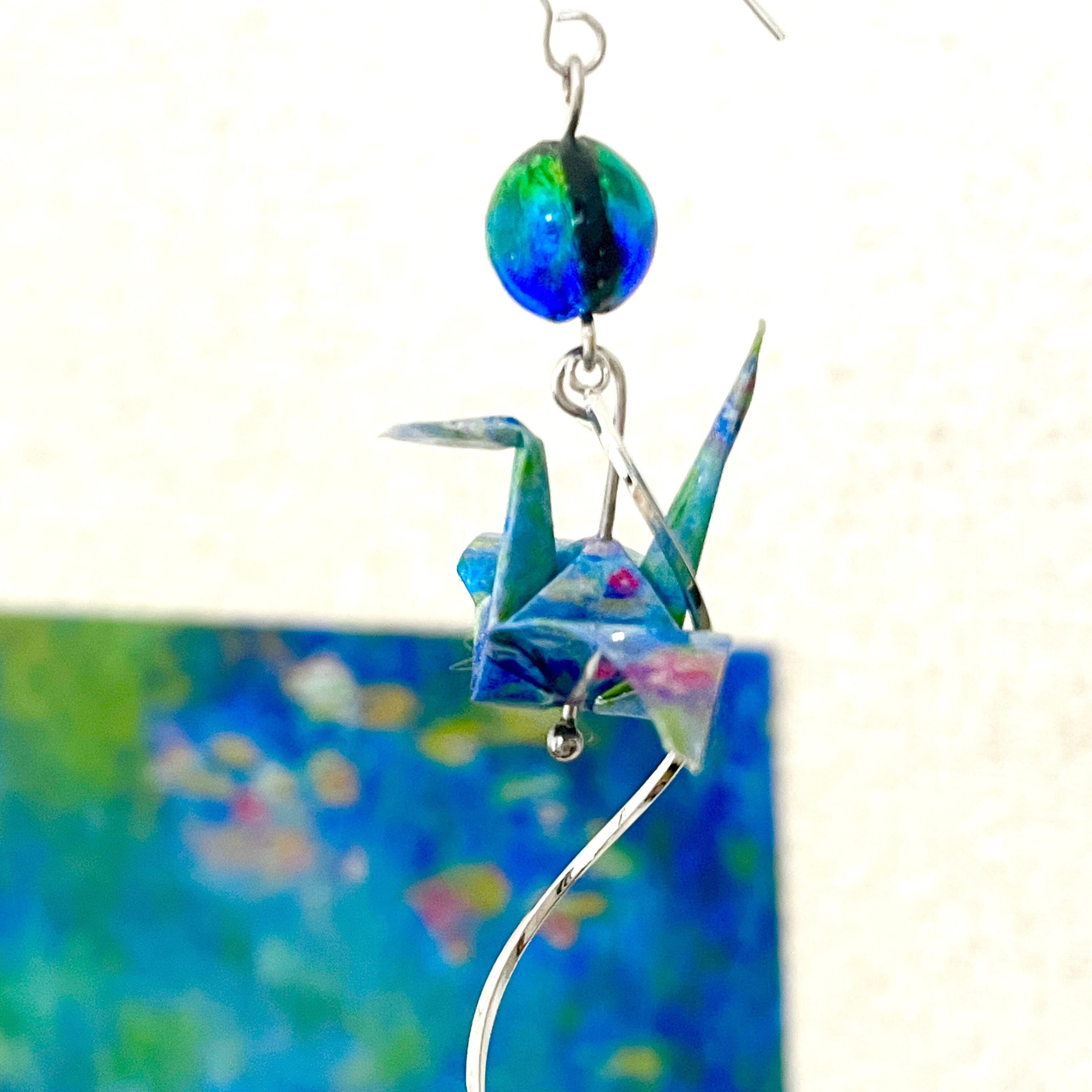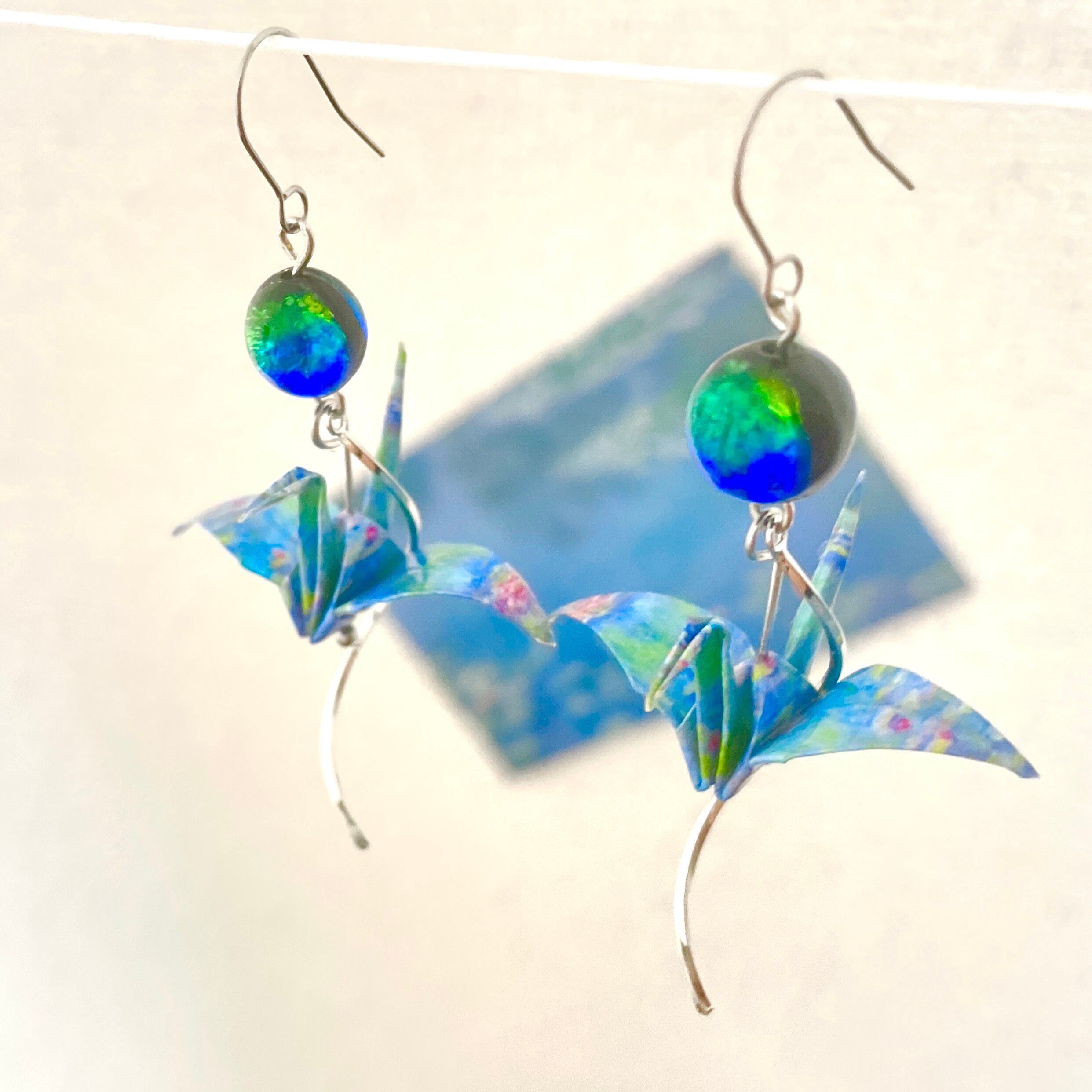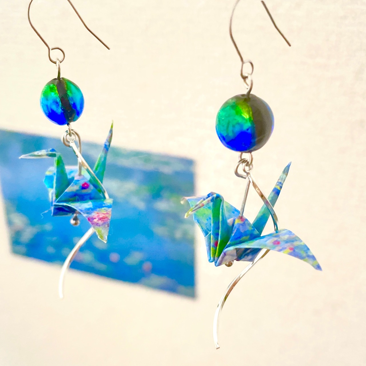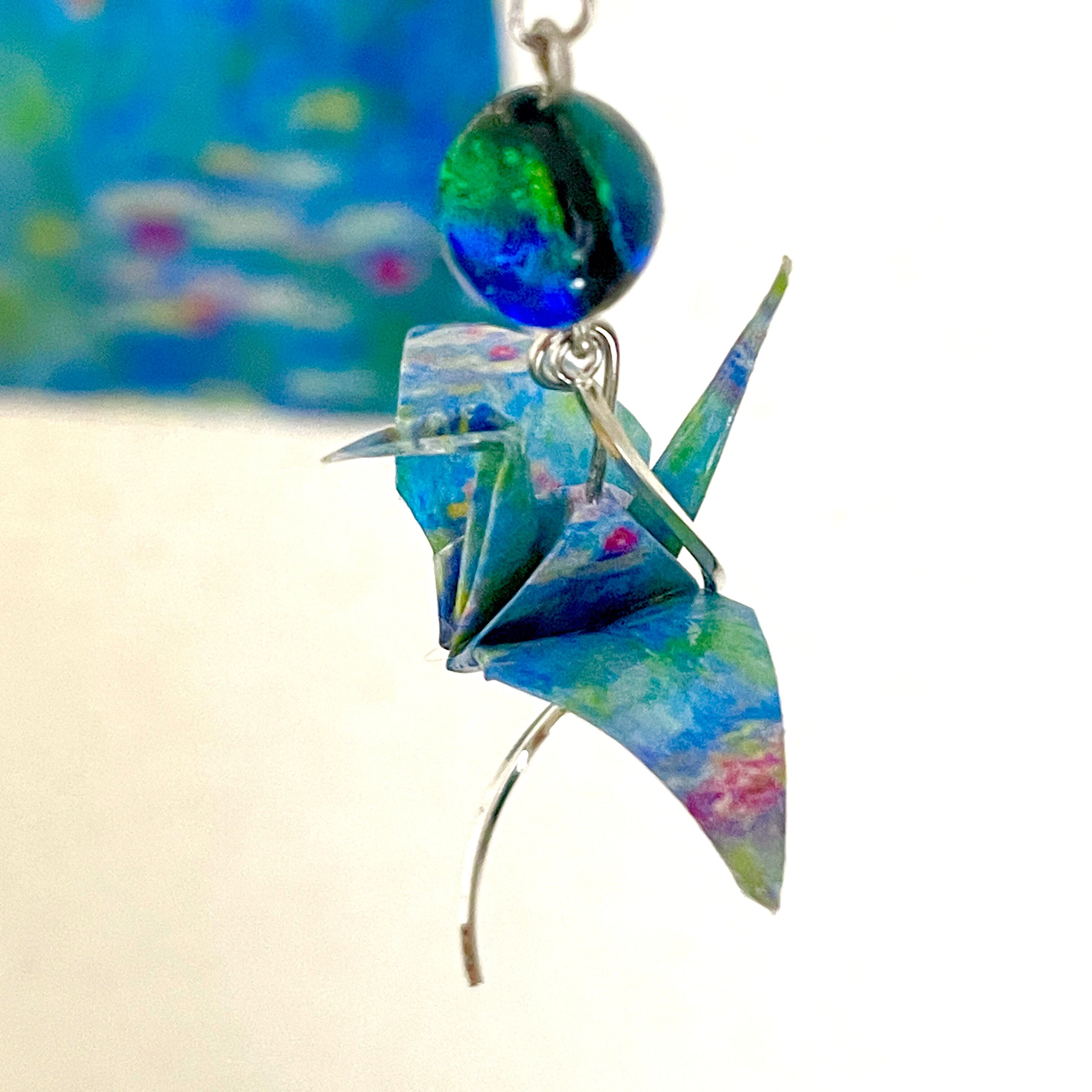モネの名作「睡蓮」をモチーフにした折り鶴ピアスは、アートと日本の伝統文化が融合した特別なハンドメイド商品です。軽やかな折り鶴の形が耳元で優雅に揺れ、あなたのコーディネートに華やかさを添えます。モネの美しい色合いが施されたデザインは、見ているだけで心が和む美しさを持っています。